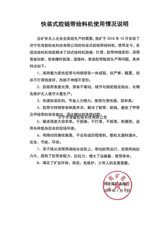 快裝式膠鏈帶給料機(jī)可實(shí)現(xiàn)完美替代物料運(yùn)輸系統(tǒng)在用的所有形式的給料機(jī),包括甲帶給料機(jī)、帶式給料機(jī)、振動(dòng)給料機(jī)、往復(fù)式給料機(jī)、鏈板給料機(jī)等,膠鏈帶給料機(jī)更好的解決了跑偏、打滑、換裝困難等問題,更利于實(shí)現(xiàn)快速裝車、高效自動(dòng)化的現(xiàn)代智能運(yùn)輸系統(tǒng)要求。